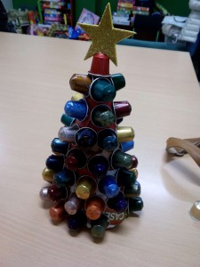 Para los que tengan bajo presupuesto para la decoración de Navidad de este año, os presento dos originales árboles de Navidad reciclando cápsulas de café.
