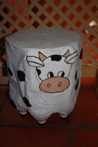 Esta vez os presento dos sencillas manualidades. La primera de ellas se trata de un asiento hecho con siete botellas de refresco, las juntaremos pegándolas con papel adhesivo. Una vez sujetos, le vamos adheriendo periódico mojado en cola para darle cuerpo al asiento. Cuando esté seco, lo pintaremos con el motivo que se deseemos. En este caso yo lo he decorado como si se tratase de una vaquita. Cuando seque la pintura, damos un poco de barniz y listo para ser utilizado.