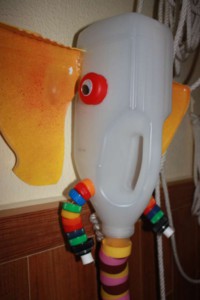 La segunda manualidad es un simpático elefante y para su elaboración utilizaremos un bote de suavizante de lavar la ropa, tapones de varios colores, otro bote al uso, alambre y silicona caliente.