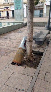 Lo que puede parecer una papelera y de hecho actúa como tal para muchas personas, por la falta que hay en la calle Real, no es más que un hornillo donde se asan las castañas y que desde septiembre del año pasado ha estado encadenado al árbol, donde por las tardes era usado.