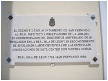 "El Excmo. e Iltmo. Ayuntamiento de San Fernando al Real Instituto y Observatorio de la Armada en conmemoración del doscientos aniversario de su instalación en la Real Isla de León y en reconocimiento de su dilatada labor científica y de las especiales vinculaciones de este centro con nuestra ciudad.