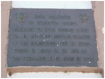 "Este Oratorio se inauguró siendo Alcalde de esta ciudad Excmo Sr. D. Antonio Moreno Olmedo y fue bendecido por el Rvrdo Padre D. Juan M. De Mulas.