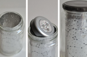 La primera de las cuatro manualidades es una lámpara de estrellas con la que podremos distinguir las diferentes constelaciones. Todo lo que necesitaremos será: un tarro de cristal de boca ancha (los de conservas ofrecen el tamaño perfecto), una bandeja o molde de aluminio desechable y una fuente de luz pequeña.