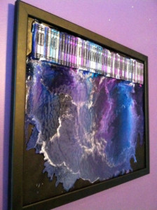 -El primer paso es pegar las ceras en la parte superior del lienzo ayudándonos de la pistola de silicona. Debemos colocar los colores de manera alterna, de tal modo que no haya dos iguales juntos. Una vez allí los dejamos secar un par de minutos para que se queden completamente adheridos al lienzo. Seguidamente, aplicaremos calor con el secador de pelo y, a máxima potencia y hacia abajo, lo dirigiremos hacia las puntas de las ceras. Veremos como poco a poco se van derritiendo y los colores se van mezclando de manera aleatoria creando la forma de una auténtica nebulosa.