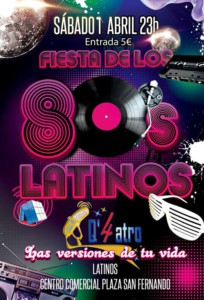 Esta noche en Latinos ubicado en el Centro Comercial y de Ocio San Fernando Plaza, a partir de las 23: 00 horas tendrá lugar la 'Fiesta de los 80’s Latinos' con la intervención del grupo musical Q’4atro. Precio 5 euros.
