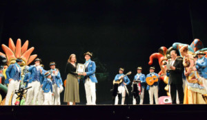 El director de la comparsa 'El ángel de Cádiz', José Luis Otero, recibió en el escenario y de manos de la primera edil de San Fernando un artístico recuerdo que forma parte del premio de 3.000 euros que logró esta agrupación por su sentida letra dedicada a Camarón de La Isla en el concurso convocado dentro de los actos que el Ayuntamiento isleño está celebrando para conmemorar el 25 aniversario del fallecimiento del genial cantaor y que se cumple en 2017. El premio estaba destinado a cualquiera de las agrupaciones inscritas en el Concurso Oficial de Agrupaciones Carnavalescas (COAC) que se celebró en el coliseo gaditano del 22 de enero al 24 de febrero.