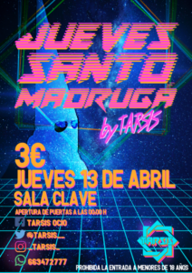 Mañana jueves en la calle San Nicolás 9, la Sala Clave ofrece su fiesta 'Jueves Santo Madrugá’ a partir de las 00:00 horas, a cargo de la promotora Tarsis. Precio 3 euros.