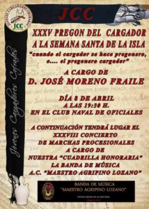 En breves instantes, hoy 8 de abril a las 19:30 horas en el Club Naval de Oficiales tendrá lugar el 'XXXV Pregón del Cargador' organizado por la Asociación de Jóvenes Cargadores Cofrades (JCC) de la mano de José Moreno Fraile.