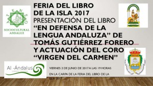 El viernes 2 de junio a las 19,30 horas tendrá lugar la presentación de los libros "En Defensa de la Lengua Andaluza" y "Lengua Andaluza Apuntes para su Gramática y su Diccionario" de Tomás Gutiérrez Forero y la actuación del Coro Mariano "Virgen del Carmen" de la Peña Cultural Carnavalesca "Los Catavinos" bajo la dirección de Manoli de los Santos. Al finalizar el acto el autor firmará ejemplares de su obra en el stand de la Librería Al Ándalus.