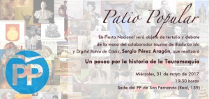 Este miércoles 31 de mayo, a las 19:30 horas, el PP isleño celebrará una nueva edición de su ciclo cultural 'Patio Popular'. En esta ocasión el tema que se abordará será el de la tauromaquia, la historia de la Fiesta Nacional. Para ello se contará con la presencia del crítico taurino de Radio La Isla Sergio Pérez Aragón.