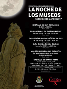 “Nos sumamos a esta celebración con la intención no sólo de acercar a la ciudadanía el rico patrimonio del que San Fernando disfruta en diferentes escenarios, sino también como uno de los objetivos marcados por el gobierno municipal: el fomento y la promoción de nuestra variada oferta expositiva para generar un turismo cultural de nivel que sabrá apreciar lo atractivo de espacios tan distintos, desde el material milenario del Castillo de San Romualdo al legado de Camarón de La Isla, desde la valiosa herencia castrense mostrada en el Museo Naval a los edificios constitucionales gracias a las rutas guiadas, y todo ello con una ampliación de horarios que facilitará las visitas y la presencia de personas que lleguen de otras ciudades”, especifica Conrado Rodríguez, que ha querido agradecer la colaboración de diversas instituciones, asociaciones, artistas y empresarios en conformar un programa que se prolonga durante todo el sábado y con especial énfasis en la noche y madrugada, concretamente hasta las 02:00 horas.