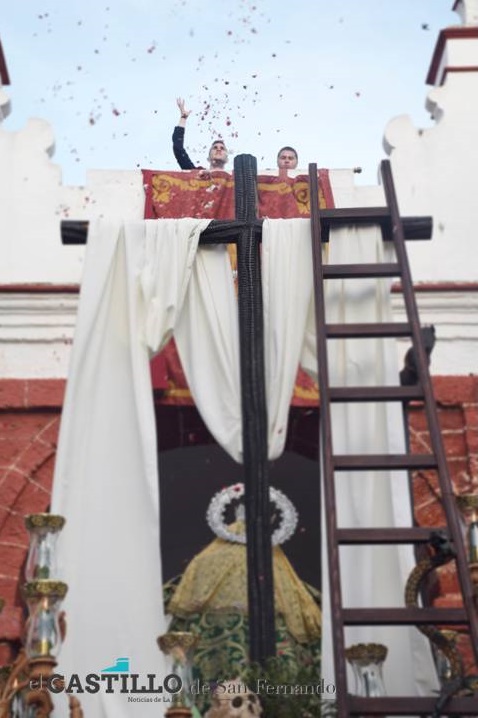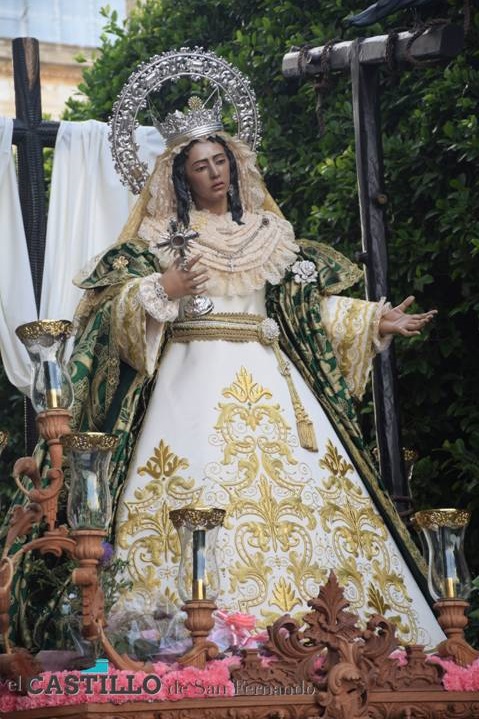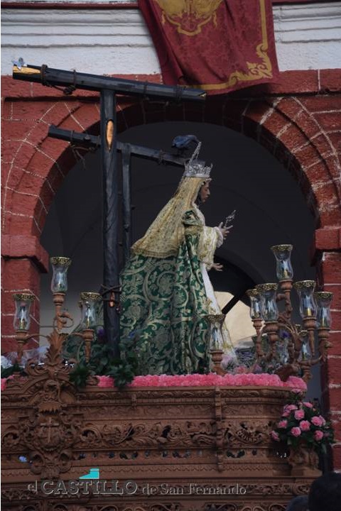 La imagen de Santa Elena, titular de la Hermandad de Gloria de la Iglesia de San Francisco, procesionó en la tarde del sábado por las calles del centro de San Fernando. La Hermandad, que estuvo acompañada por la banda de música de la Hermandad del Nazareno, estrenó la talla del respiradero lateral derecho y las maniguetas, realizadas por el tallista isleño Manuel Oliva. También estrenó el bordado completo de la saya de la santa.