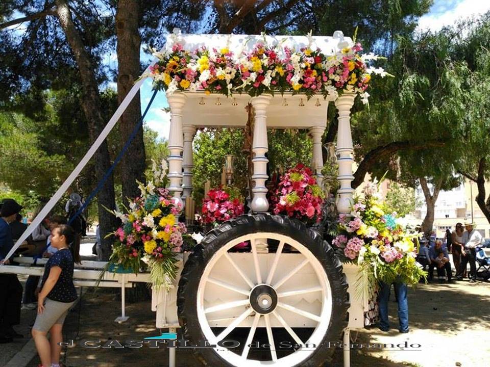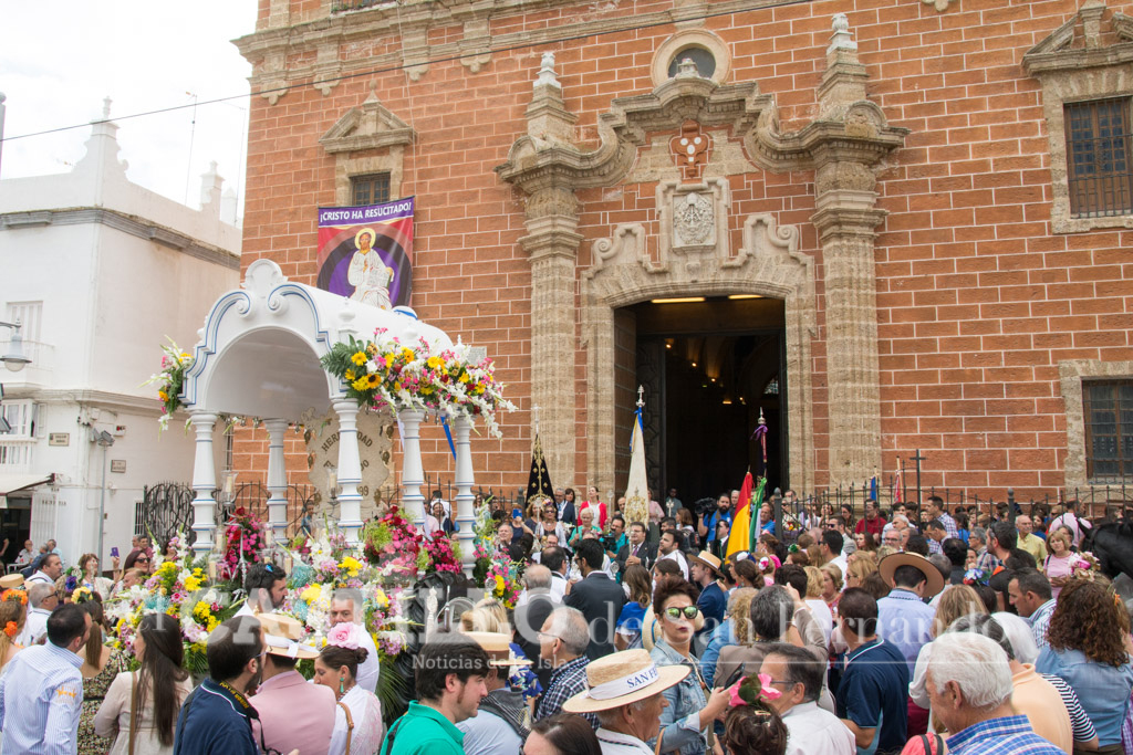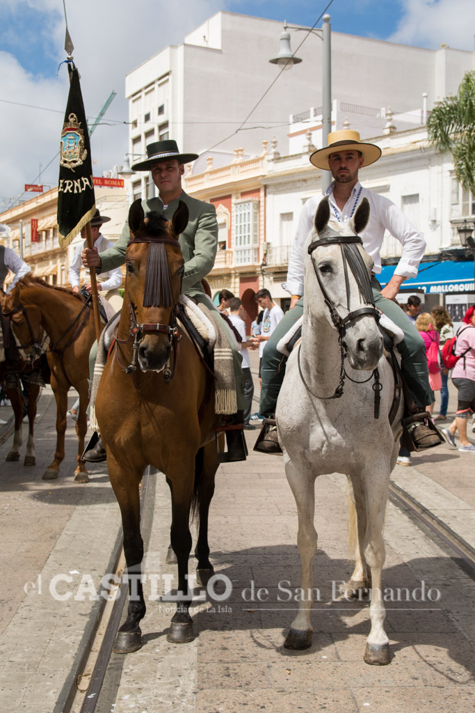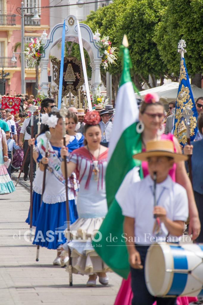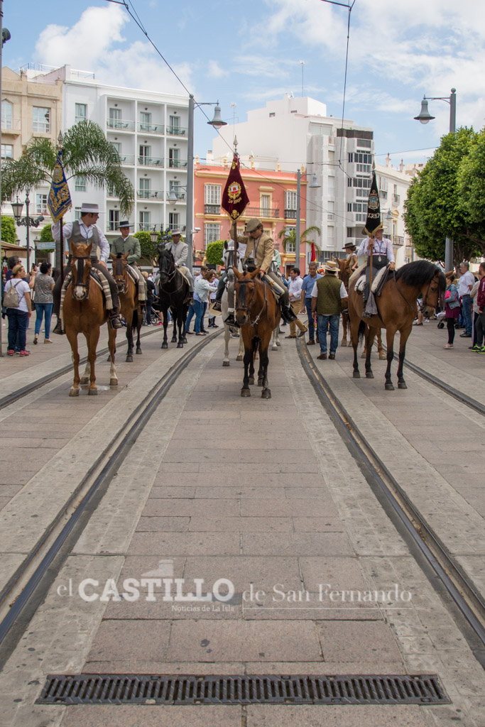 La Hermandad del RocÃo de San Fernando pudo pasear la carreta con el Simpecado por la calle Real este lunes, después de no poderlo hacer el año pasado por la lluvia. Los romeros de San Fernando pasaron por calles como San Rafael, Colón, Rosario y Real, siendo recibidos por alumnos de colegios como La Salle, Miramar y CompañÃa de MarÃa.