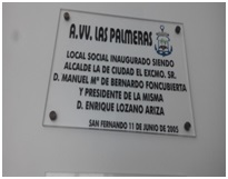 Es indudable la importancia de las Asociaciones de Vecinos en nuestra ciudad, ya que suponen todo un factor de dinamización de su vida social. Aquà tienen ustedes la placa que deja recuerdo de la inauguración del local social de una de ellas, la de las Palmeras: