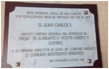 "Este Hospital Naval de San Carlos fue inaugurado bajo el reinado de S.M el Rey D. Juan Carlos I siendo Capitán General del Estrecho el Excmo. Sr. Almirante D. Vicente Alberto y Lloveres y su primer Director el Ilmo. Sr. Coronel Médico D. Conrado Montesinos Ferrando.