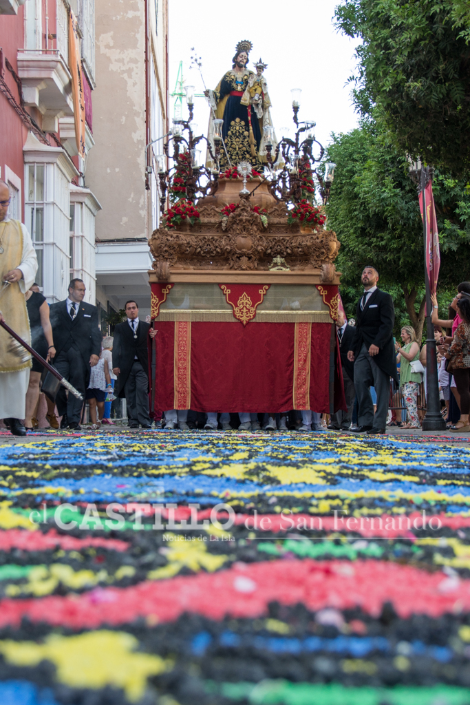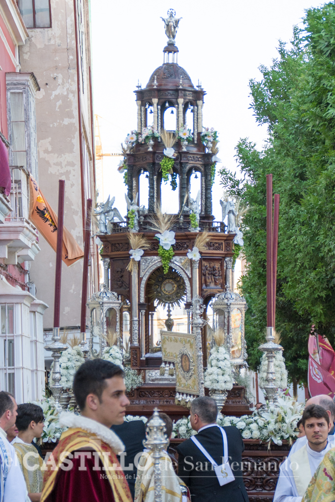 En una tarde de un calor intenso que restó público a primeras horas, se celebró una nueva procesión del Corpus Christi de San Fernando, que este año recuperaba el itinerario de siempre por Real, Plaza de la Iglesia, Rosario, General García de la Herrán, Las Cortes, Plaza del Rey, General Valdés, Alameda Moreno de Guerra, Real y recogida.