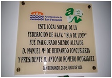 "Este local social de la Federación de AA.VV "Isla de León" fue inaugurado siendo Alcalde D.Manuel Mª de Bernardo Foncubierta y Presidente D. Antonio Romero Rodríguez.