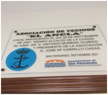 "Asociación de Vecinos El Ancla. Local inaugurado el 28 de Septiembre de 1001. Siendo Alcalde de la ciudad el Ilmo. Sr. D. Antonio Moreno Olmedo y Presidente de la Asociación D. José Mª Carrillo Casas.