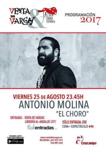 Mañana viernes 25 de agosto a las 23:45 horas, enmarcada en la programación de la ‘IV edición de la Isla Ciudad Flamenca’, tendrá lugar en la Venta de Vargas la actuación de Antonio Molina ‘El Choro’.