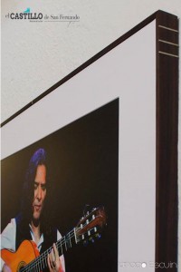 “Una peculiaridad que pocos se fijan, pues para mi están importante la fotografía en sí como el marco que escojo, en cada exposición busco el marco más adecuado, pues forman parte de la obra. En este caso si nos fijamos en los marcos, (acercándose a ellos) no son palos marrones oscuros al uso, son palos de palos santos, que son los empleados para hacer el diapasón de la guitarra. Es más, si observamos de cerca, en cada cuadro donde aparece una sonanta hay tres trastes de guitarra. Los cuadros de gran formato están cortados por la mitad y se ve que es el ensamble de la parte inferior de la guitarra. Cabe destacar que el luthier me ha regalado los originales de las guitarras de Javier Ruibal y de ‘Moraito’. También he escogido el maquetado final utilizando paspartú, pues busco que la mirada se centre en la fotografía.