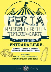 El Colegio La Salle, con entrada por la calle Tomás del Valle, celebra hoy y mañana domingo dÃa 17 de septiembre  la I edición de la "Feria Gastronómica y Productos tÃpicos de Cádiz" donde diferentes empresas exponen y venden sus productos más exquisitos y especiales, como quesos, aceites, dulces, etc.
