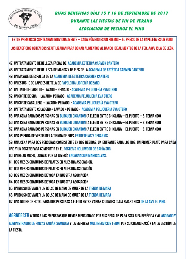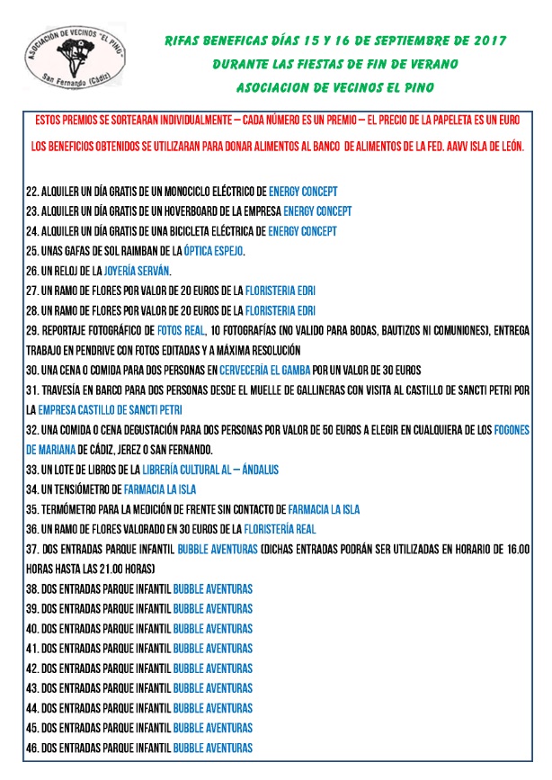 "La lista de premios irá modificándose a medida que se vayan incorporando patrocinadores, cuyos beneficios se utilizarán para el banco de alimentos de la Federación AAVV Isla de León. Interesados contactar a través del correo avvelpino@gmail.com, o en el teléfono 655 671 734. La intención es llegar a poder vender 1.000 papeletas, cada una a uno euro, esperemos poder llegar a esta cifra y así ayudar a los más necesitados de nuestra ciudad". Declara a este periódico Enrique Fuentes.