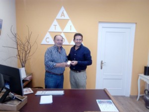 En la foto, Jesús Hidalgo (presidente del CLUB DE HOCKEY SAN FERNANDO) hace entrega del Carnet de Socio a Claudio Hernández (gerente de Áticos Inmobiliaria).