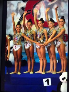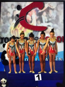 Y para finalizar la actuación de los Conjuntos Absolutos salió a competir el Conjunto Infantil Absoluto con 2 pares de Mazas y 3 Pelotas y compuesto por: Lucía de Cozar García, Ana Rodríguez Moreno, Yara Castanheira Oneto, María del Amor Anelo Seguí y Alexia Puig Lepiani que realizaron unos muy buenos pases sin fallos y que consiguieron la siguiente medalla de Oro en la Clasificación Final, lo que les da una gran fuerza y confianza para los próximos Campeonatos.
