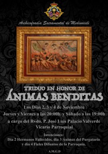 Las Intenciones serán; día 2 por los Hermanos Fallecidos, día 3 por las Ánimas del Purgatorio, día 4 por los Fieles Difuntos de la Parroquia.