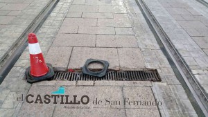 Cuando se espera que el tren tranvía inicie de nuevo su paso por San Fernando en pruebas, la situación de la calle en diversos puntos supone un riesgo para los peatones, que se acrecentarán con el agua de la lluvia.