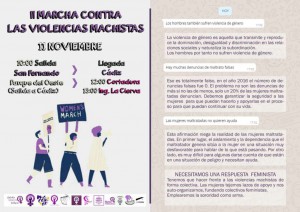 El Café Feminista de San Fernando, junto a LaVanda Morada, Acción Feminista y Marea Joven de San Fernando y colectivos feministas de la provincia tienen previsto para mañana sábado 11 de noviembre a las 10:00 horas la ‘II Marcha contra las Violencias Machistas’ para denunciar el terrorismo machista.