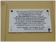 "Para perpetuar la gratitud de este pueblo a la obra pedagógica y cristiana de la Benemérita Institución de San Juan Bautista de La Salle y con motivo del quincuagésimo aniversario de su establecimiento en esta ciudad. El Excmo. eIltmo. Ayuntamiento acordó dedicarle este recuerdo.