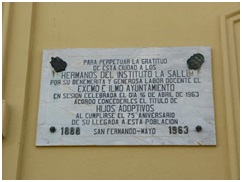 "Para perpetuar la gratitud de esta ciudad a los Hermanos del Instituto La Salle por su benemérita y generosa labor docente el Excmo e Iltmo Ayuntamiento en sesión celebrada el día 16 de abril de 1963 acordó concederles el título de Hijos Adoptivos al cumplirse el 75 aniversario de su llegada a esta población.