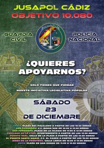 La asociación formada por Policías Nacionales y Guardias Civiles (JUSAPOL), cuyo objetivo es la equiparación económica con las policías autonómicas, va a instalar el próximo día 23 puestos de recogidas de firmas en distintas localidades de la provincia en virtud de la Iniciativa Legislativa Popular que este movimiento pretende presentar próximamente y cuyo objetivo es el conseguir como mínimo a nivel nacional las 500.000 firmas que la ley establece, si bien desde Jusapol están convencidos de que serán muchas más debido al apoyo social que tiene este movimiento.