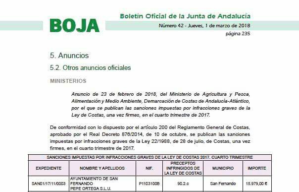 El Boletín Oficial de la Junta de Andalucía (BOJA) ha revelado que el Ayuntamiento de San Fernando ha sido sancionado por infringir “gravemente” la Ley de Costas en la playa de Camposoto. En el anuncio del Ministerio de Medio Ambiente que publica en su edición de ayer, el BOJA informa que el Consistorio isleño tendrá que abonar 15.979 euros de multa por “la ejecución no autorizada de obras e instalaciones en el dominio público marítimo-terrestre, así como el aumento de superficie, volumen o altura construidos sobre los autorizados”, según se recoge en el artículo 90.2.c de la citada Ley.