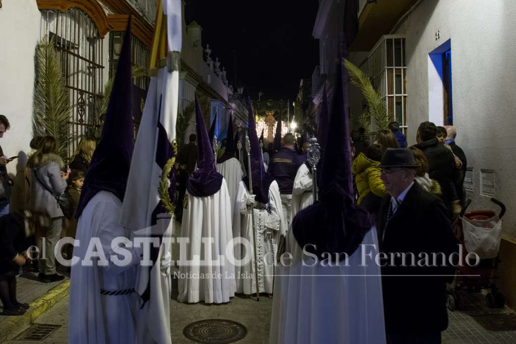 La lluvia de la mañana se fue y las nubes fueron abriéndose paso poco a poco para dejar un Domingo de Ramos al que el viento afectó en sus primeras horas para terminar con candelerías encendidas. La mayor novedad del día fue el estreno de la Hermandad de Humildad y Paciencia, con cuatro imágenes nuevas en el paso del Señor de la Humildad y Paciencia, como dos soldados romanos jugándose la túnica de Cristo, un centurión romano que los contempla y espera con tabla de Rey de los Judíos para poner en la cruz y un sayón que espera igualmente con los clavos y el martillo para proceder a la crucifixión. La agrupación Ecce Mater, de Cádiz acompañó el misterio, mientras que el paso de palio de la Virgen de las Penas, único que procesiona con tres imágenes, lo hizo acompañado por la banda Maestro Agripino Lozano.