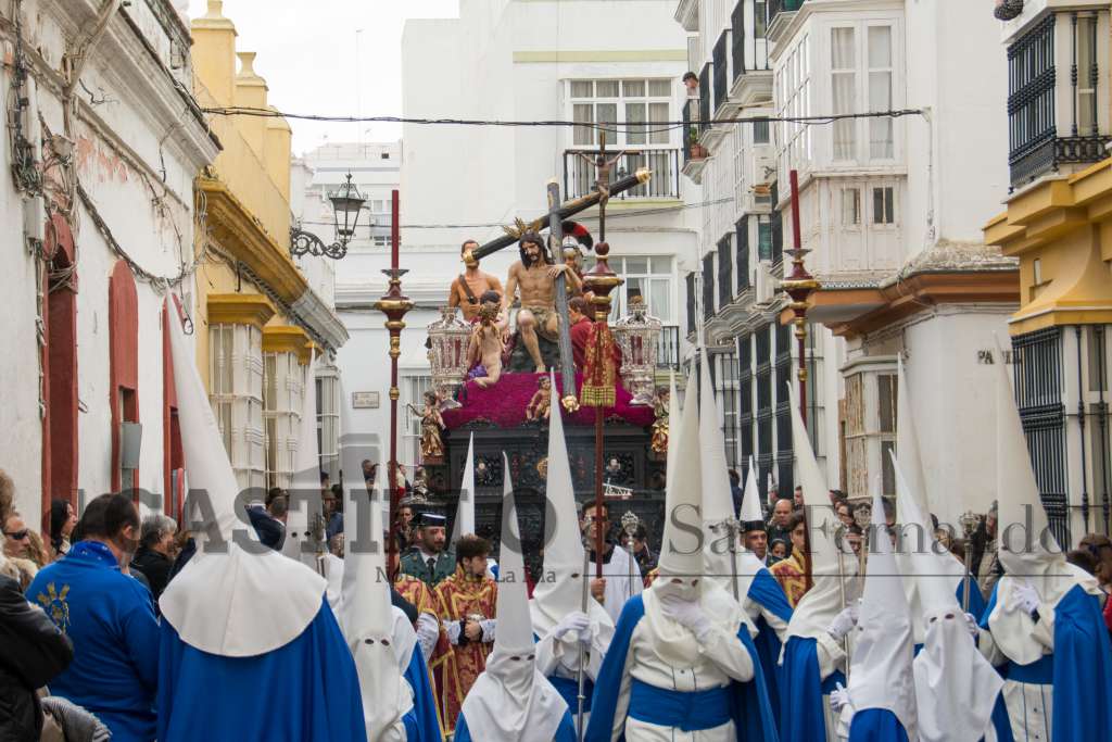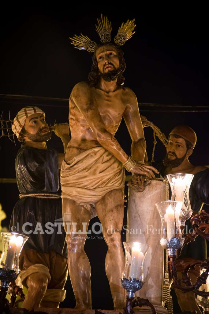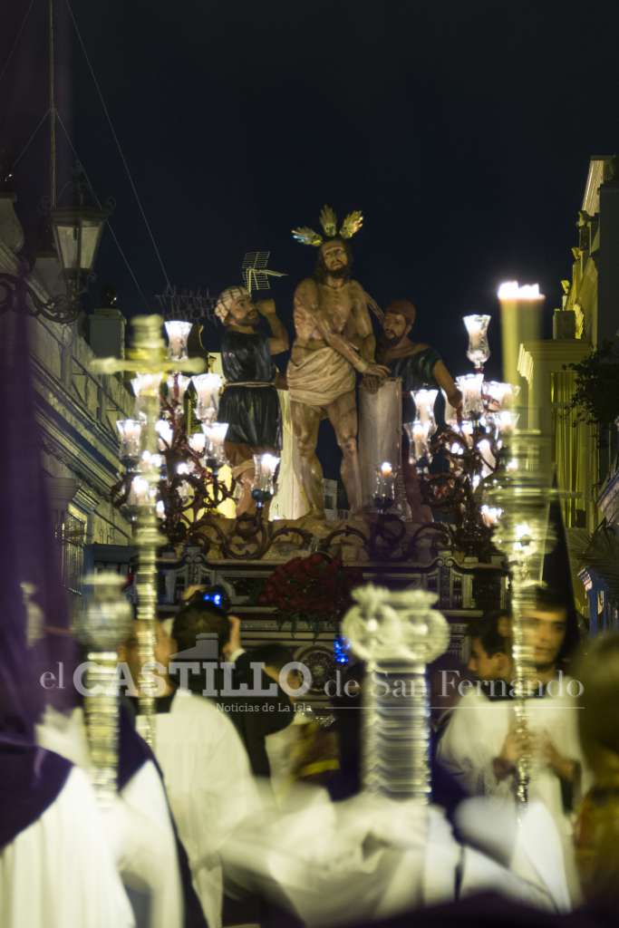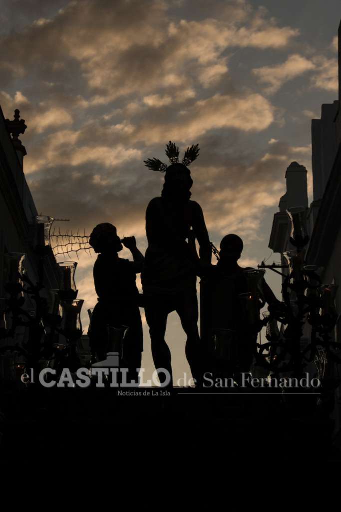 Columna era la tercera de las hermandades en hacer su salida con una Plaza de la Iglesia llena. Los pasos iban exornados a base de rosas rojas en el misterio y rosas en su color para el paso de palio. Nuevamente, el acompañamiento musical de la hermandad fue la agrupación musical Esencia Tres Caídas y la banda Maestro Enrique Montero, de Chiclana.