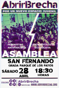 Abrir Brecha se presentó hace apenas unos meses a nivel estatal, con la intención de aglutinar a las personas jóvenes de diversas ciudades y distintos movimientos sociales. Presente en ciudades como Madrid, Barcelona o Murcia, en San Fernando empieza a tomar forma a través de un grupo de jóvenes, que supera ya la treintena, se han sumado al llamamiento 'Abrir Brecha' y tendrán la presentación el próximo sábado 28 a las 18:30 en las gradas del Parque Almirante Laulhé.