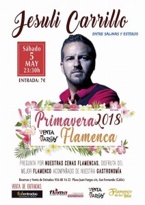 La Venta Vargas este sábado 5 de mayo a partir de las 23:00 horas, albergará en su patio la actuación del Jesuli Carrillo con su nuevo espectáculo ‘Entre Salinas y Esteros’ dentro del programa del Ciclo Primavera Flamenca 2018.