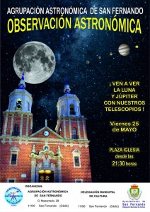 La Agrupación Astronómica de San Fernando realizará una velada de observación astronómica este viernes 25 de mayo a partir de las 21:30 horas en la Plaza Iglesia.
