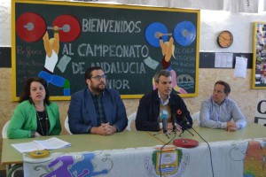 El primer teniente de Alcaldía, Fran Romero; la delegada municipal de Deportes, Maite Lebrero; el diputado provincial de Deportes, Jaime Armario, y el presidente del Club Halterofilia San Fernando, Adolfo Victorián, han presentado esta mañana en el Colegio Público Reina de la Paz el cartel del Campeonato de Andalucía Junior, que se va a celebrar este sábado 5 de mayo en las instalaciones del club en el citado centro de enseñanza.