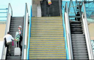 Se vieron obligados a usar la escalera mecánica al estar por enésima vez el ascensor fuera de servicio, perdiendo el equilibrio por el peso de su equipaje y cayendo ambos hacia atrás.