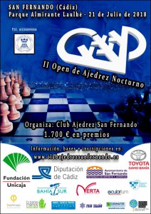 Las jornadas finalizarán con el ‘II Open de Ajedrez Nocturno de San Fernando’, tras la buena aceptación del primer torneo nocturno que tuvo lugar el pasado mes de septiembre, en este año repiten en su segunda edición el 21 de julio en el Parque Almirante Laulhé, dando comienzo a las 19:00 horas, cuyo sistema de juego será el suizo a 8 rondas, con un ritmo de juego: 8 min, más 3 segundos por jugada. (Válido para ELO FADA). Los desempates serán; Buchholz (-1), Buchholz total y Sonnenborn-Berger. La entrega de premios se realizará alrededor de las 23:45 horas.