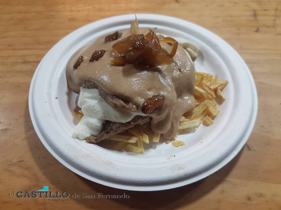‘La Tapería de Ari’. Milhojas de solomillo al Px, con queso de cabra, pasas y cebolla caramelizada