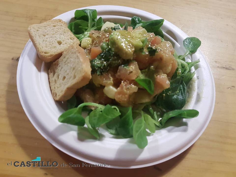 ‘Montjuic’. Tartar Caprese: Tomate natural, mozarella sobre base de canónigos con aguacate y albahaca aderezado con una vinagreta de mostaza de Dijón.