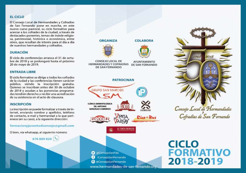 El Consejo local de Hermandades y Cofradías de San Fernando pone en marcha, por tercer año consecutivo, su ciclo formativo con el objetivo de acercar a los cofrades de la ciudad al conocimiento de temas de índole religiosa, patrimonial, histórica o económica, entre otros, que resultan de interés para el día a día de nuestras hermandades.
