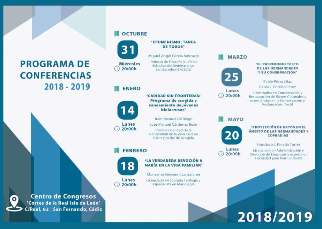 Este ciclo formativo se dirige a todos los cofrades de la ciudad y las conferencias, que se llevarán a cabo en el Centro de Congresos ‘Cortes de la Real Isla de León’ (C/Real, 83) tienen carácter público, siendo la inscripción totalmente gratuita. Quienes se inscriban antes del 30 de octubre de este año y acudan a las ponencias programadas tendrán derecho, además, a recibir una acreditación de su asistencia en el acto de clausura.