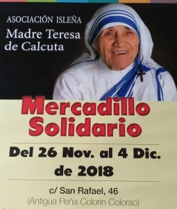El próximo día 26 de noviembre a las 10:00 horas la Asociación Isleña Madre Teresa de Calcuta abrirá su Mercadillo Navideño situado en la calle San Rafael, 46.