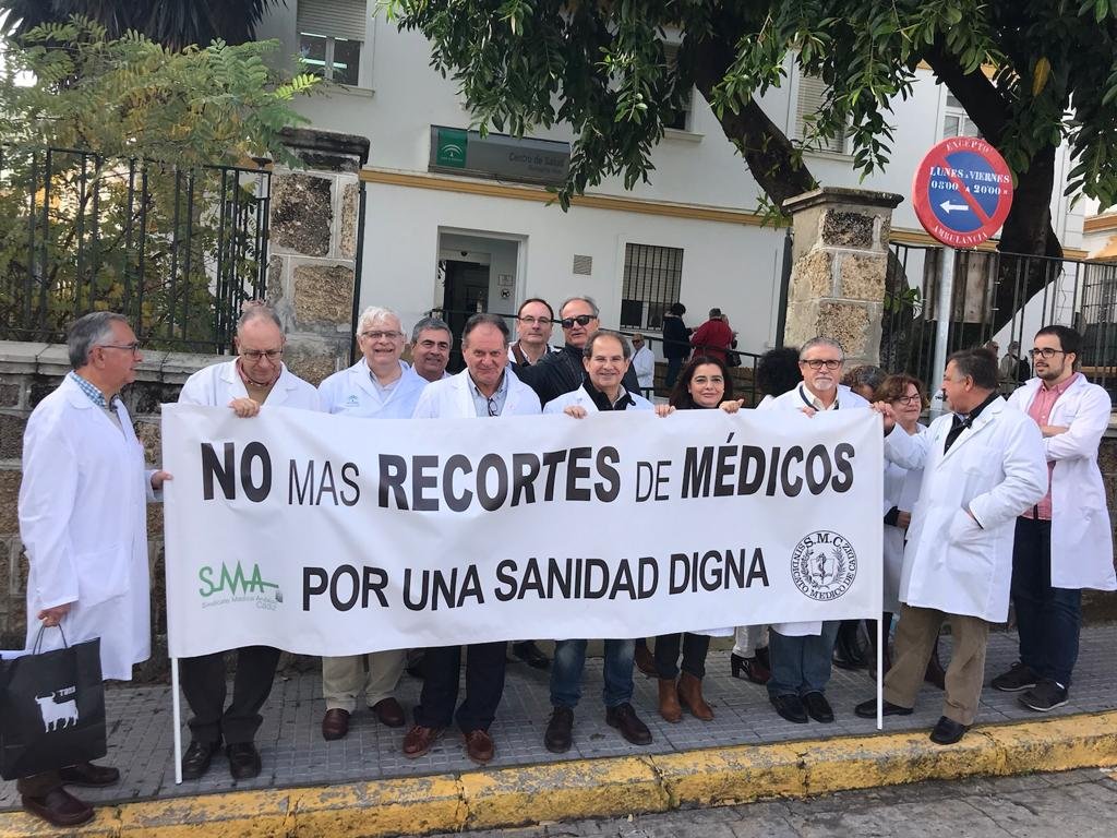 Médicos del Servicio Andaluz de Salud respaldaron la convocatoria provincial en la puerta del Centro de Salud Rodríguez Arias, para reclamar mejoras en la atención primaria, tras el deterioro sufrido por la sanidad andaluza en los últimos años por la crisis.