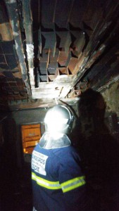 Se trataba de una habitación de estudio que se ha visto totalmente afectada: contenido y por temperatura desprendiendo las bovedillas del techo y dejando al descubierto la armadura de las vigas. El resto de la casa por humo y calorías así como las zonas comunes. Se ventiló la zona con ayuda de turboventilador y se sanearon las paredes y techos afectados. La vivienda quedó precintada así como la habitación incendiada en el piso superior a la espera de inspección por parte de urbanismo.